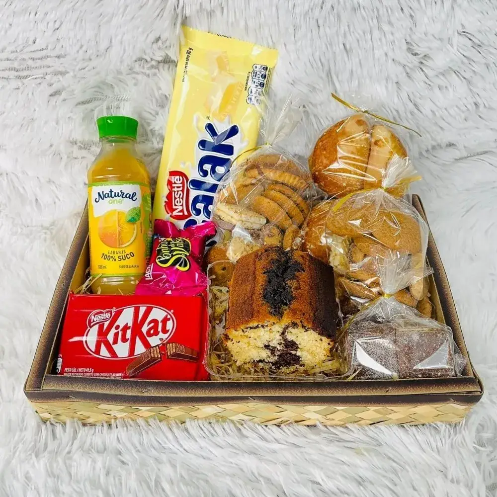 Ela é composta por 13 itens cuidadosamente selecionados: 1 barra de chocolate, 1 bebida, 1 bolo de cenoura, 1 unidade de KitKat, 2 pães de mel, 2 porções de biscoito, 4 salgadinhos assados, 1 bombom Sonho de Valsa e embalagem incolor que destaca toda a beleza da composição.