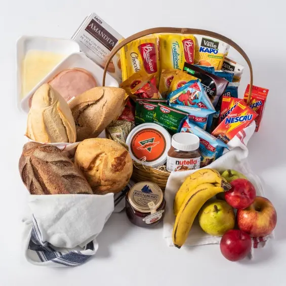 Elaborada com 41 itens cuidadosamente selecionados: 3 achocolatados, 3 biscoitos Club Social, 3 biscoitos de chocolate, 3 bolinhos, 1 caixa de bombons, 1 geleia, 1 manteiga, 1 Nutella, 5 sachês de açúcar, 5 sachês de café, 3 sachês de chá, 3 sucos, 2 tipos de frios, 4 tipos de fruta, 3 tipos de pães, embalagem incolor.