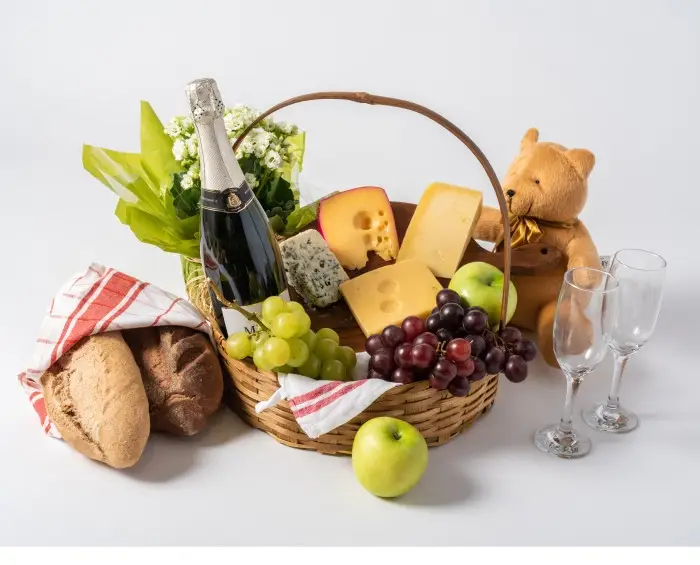 Ela é composta por 13 itens especialmente selecionados: 1 garrafa de espumante 750ml, 1 pote de flores, 2 tipos de fruta, 2 tipos de pães, 2 taças de vinho, 4 tipos diferentes de queijo, 1 urso de pelúcia e embalagem incolor que realça a elegância de cada detalhe.
