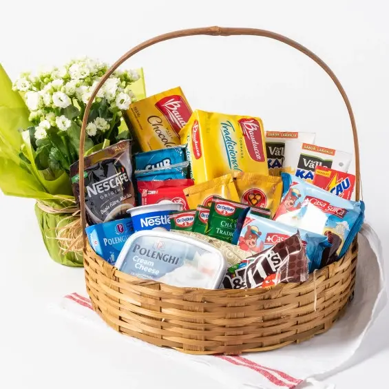 Elaborada com 27 itens: 1 achocolatado; 1 biscoito doce, 2 biscoitos salgados, 1 capuccino, 2 cafés solúveis, 1 chocolate M&M’s, 1 cream cheese, 3 chás, 1 iogurte natural, 1 KitKat, 1 pacote de torradas, 1 pote de flor, 1 queijo polenguinho, 6 sachês de açúcar, 2 sucos, 2 bolinhos de chocolate e embalagem incolor.