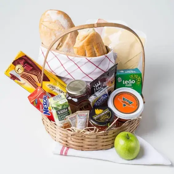 Elaborada com 16 itens cuidadosamente selecionados: 1 achocolatado, 1 biscoito Club Social, 1 biscoito de chocolate, 2 geleias, 1 manteiga, 2 sachês de açúcar, 1 café, 1 chá, 1 suco, 2 tipos de frios, 1 tipo de fruta, 2 tipos de pães, embalagem incolor.