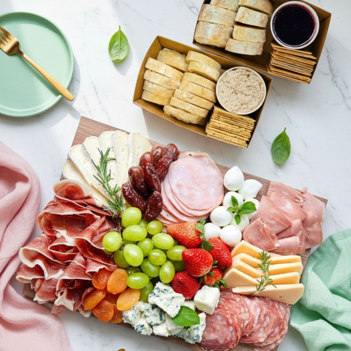 Presunto cru, salame, lombo canadense, mortadela, brie, gouda, cerejinha de búfala, gorgonzola, cracker de gergelim e linhaça e ciabatta, patê de azeitonas pretas e geleia de frutas vermelhas, damasco turco seco, tâmara fresca jumbo, uva e morango.